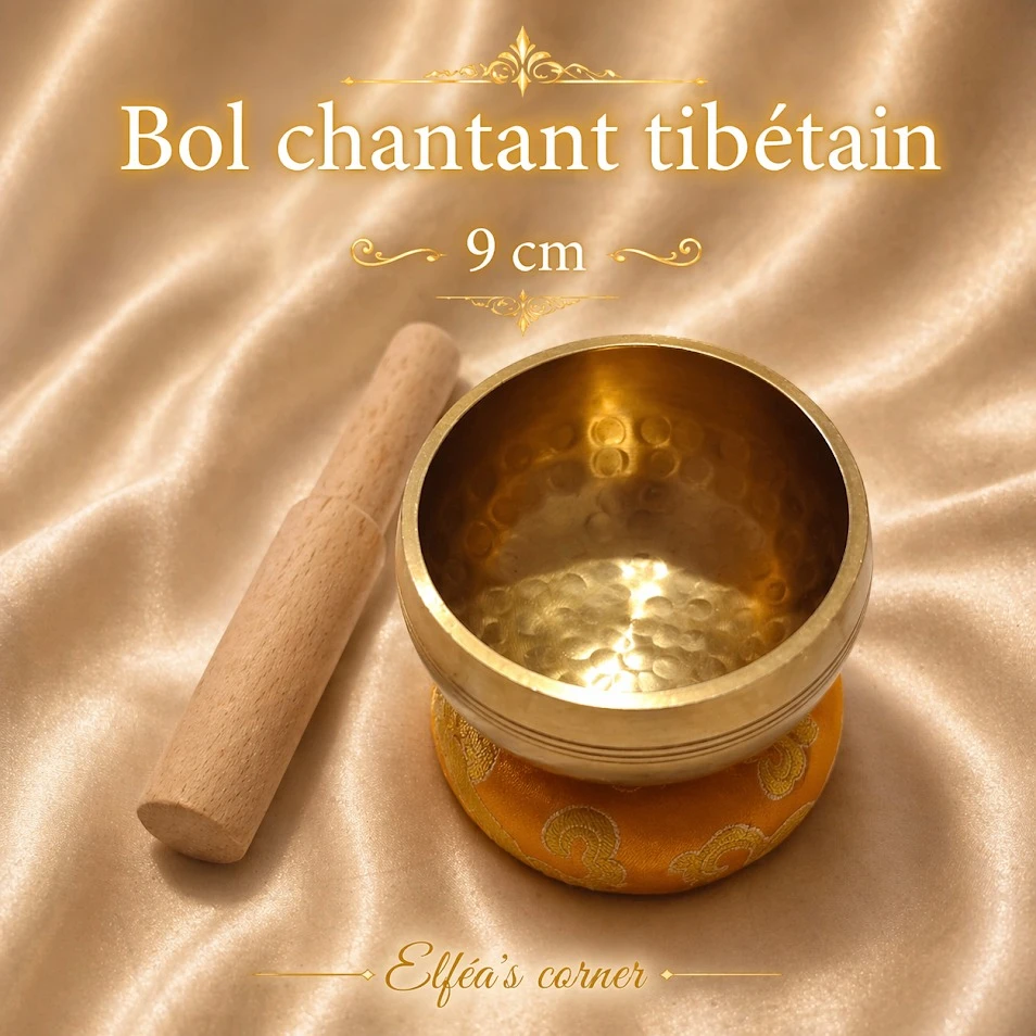 bol tibétain 9 cm martelé à la main, mailloche tout en bois, coussin brodé orange