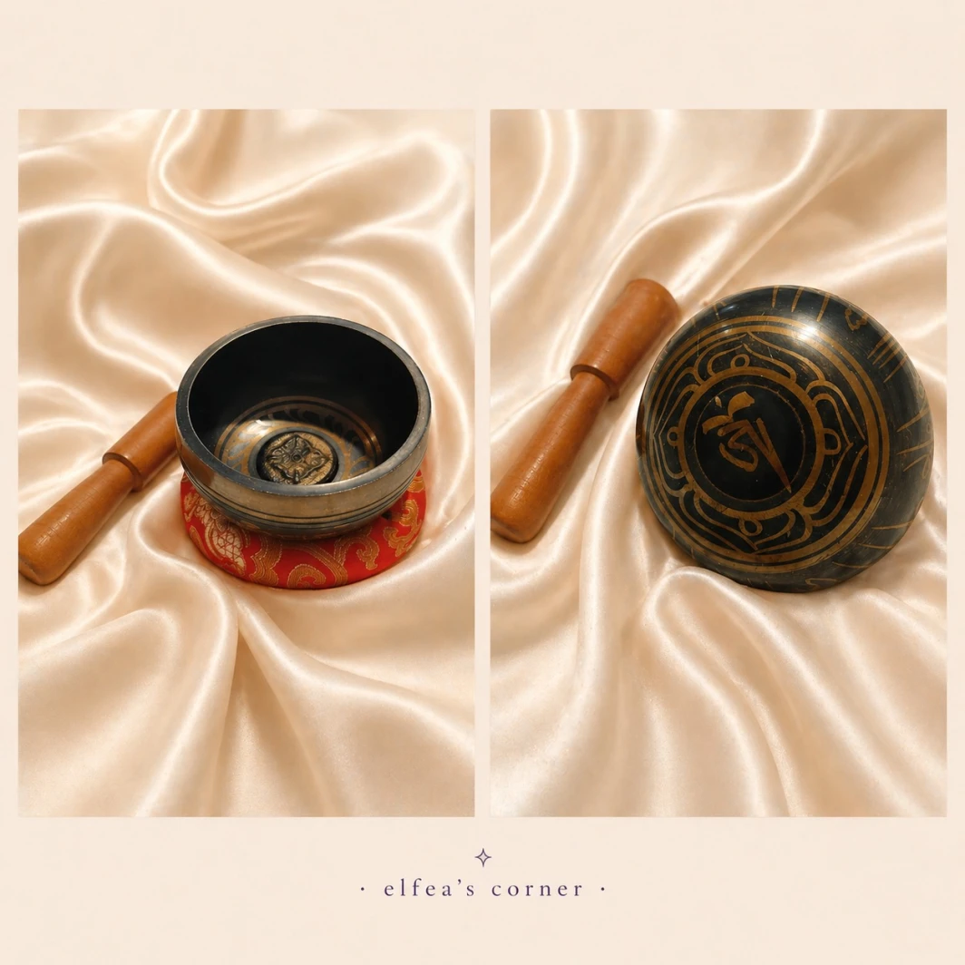 bol chantant tibétain sculpté 8 cm avec mailloche bois et cuir et coussin brodé noir